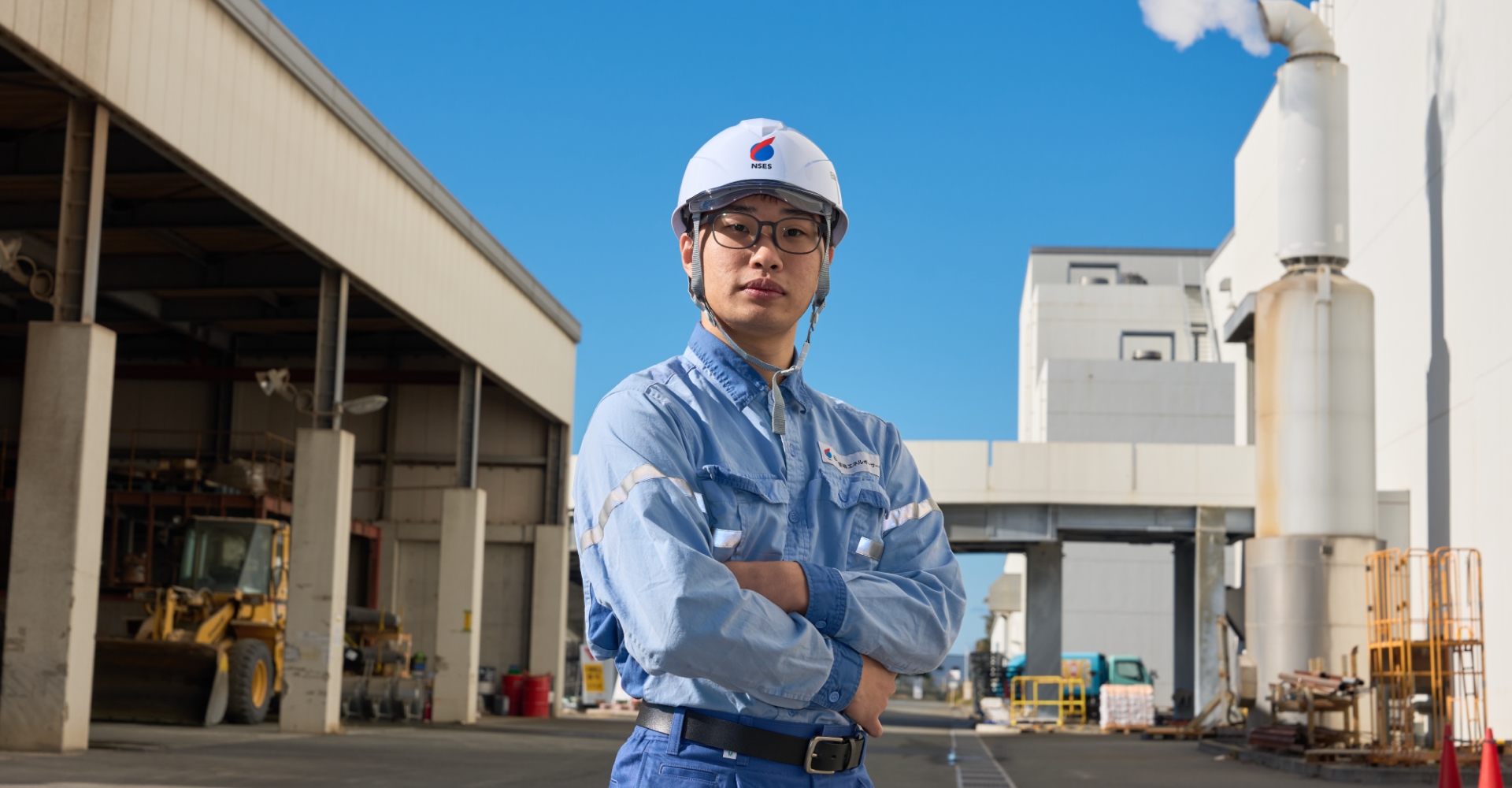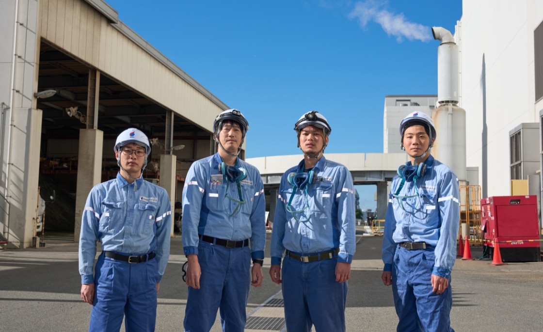 私は現在、兵庫県たつの市にある揖⿓事業所の操業班で副班⻑を務めています。当事業所では、24時間体制で溶融炉を稼働させてごみの焼却‧溶融処理を⾏うとともに、その熱エネルギーを利用した発電事業を展開しています。