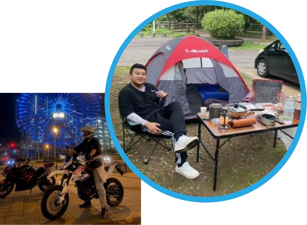 お休みの日には、バイクで福岡から⿅児島まで九州全域を⾛っています。人吉球磨の事業所にはキャンプ好き、バイク好きの同僚が多く、休みの日に同僚と一緒に阿蘇⽅⾯にキャンプに⾏くことも多いです。阿蘇のキャンプ場は最⾼です。